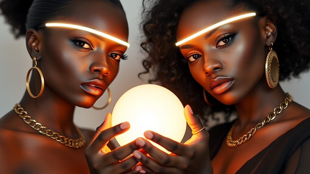Two women with contrasting skin tones, one ebony and the other alabaster, adorned in elegant gold jewelry, gracefully pose against a soft, matte white backdrop. A luminous neon band encircles their eyes in an unusual futuristic fashion, complementing their sleek black attire. Modern, minimalist, and avant-garde, the composition exudes simplicity and soft luminosity, capturing the essence of a future style, year 2066. Their hands cradle a luminous orb that casts a warm, ethereal glow, infusing the scene with a serene, mystical ambiance reminiscent of a Vogue magazine shoot, embodying ultimate professionalism, creativity, and art.
