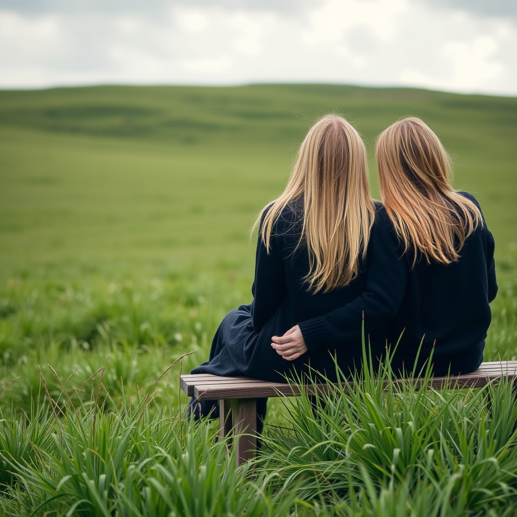 Two women with long blond hair sit intimately on a weathered wooden bench, their black wool sweaters contrasting against the vibrant greenery surrounding them. They are positioned in a sprawling grassy field, exuding a serene yet dynamic energy. The scene, reminiscent of Ren Hang's evocative style, captures a blend of natural beauty and understated elegance, as the lush green landscape stretches out beneath a softly clouded sky, enveloping them in a gentle embrace of nature's tranquility.