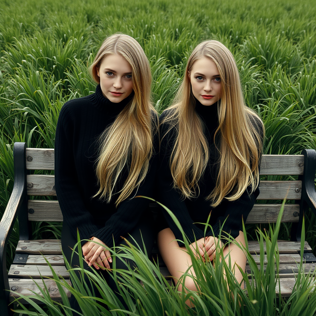 Two women with long blond hair, wearing black wool sweaters, sit elegantly on a weathered wooden bench. The lush green field surrounds them, each blade of grass swaying gently in the breeze. Their expressions are serene, exuding a sense of camaraderie and connection to their peaceful surroundings. The atmosphere carries the artistic whisper of Ren Hang's influence, with a dreamy, introspective vibe reminiscent of nostalgic Tumblr imagery. The composition is intimate and understated, capturing a moment of quiet reflection amidst the vast, open landscape.
