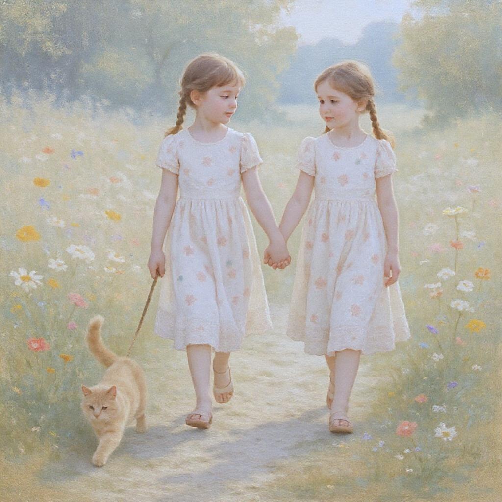 Two young girls in light-colored pastel dresses walk hand-in-hand along a gently textured path. They are surrounded by a meadow teeming with wildflowers in various pastel hues and shades. A playful light-orange tabby cat follows closely, its leash weaving ahead of one girl and crossing gently in front of the other. Their dresses are flowing and detailed, adorned with intricate patterns in soft, muted colors. Both girls wear their hair in neatly braided pigtails. The lighting is soft and diffused, capturing the serene ambiance of the outdoor setting. This scene is depicted as a serene tableau, rendered in soft pastel oil colors. The painting features delicate brushwork and a rich color palette, creating a photorealistic and detailed depiction of the idyllic moment.
