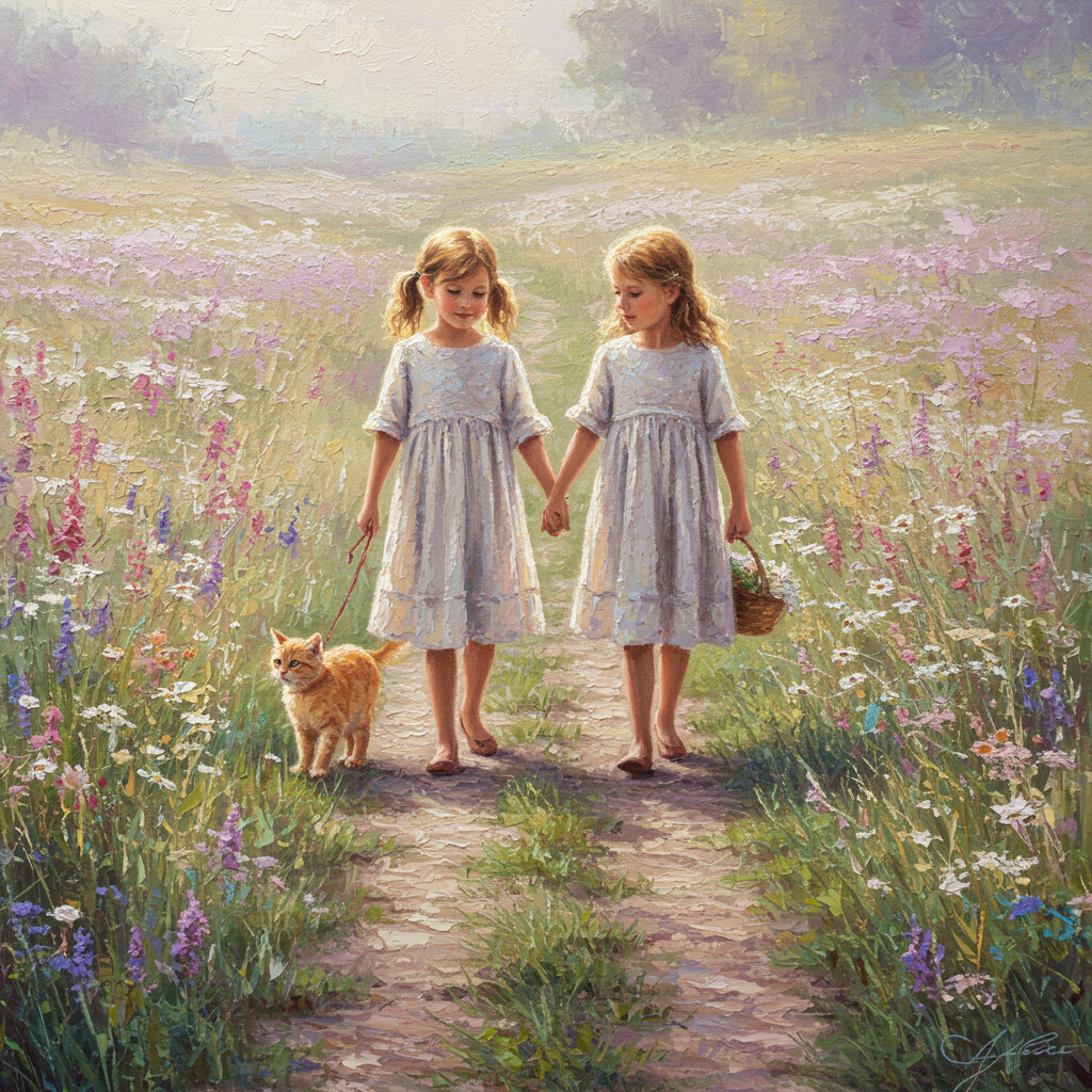 Two young girls in light, pastel-colored dresses stroll hand-in-hand along a textured path. They are enveloped by a meadow brimming with wildflowers in an array of soft pastel shades. Accompanying them is a light-orange tabby cat, whose leash is gently held by one of the girls, crossing in front of the other who follows closely behind. Their dresses, detailed and flowing, boast intricate patterns and muted hues. Their hair is styled in charming pigtails, gently swaying with each step. The lighting is soft and diffused, evoking the tranquility of an outdoor setting. The scene is captured in serene pastel oil colors, using delicate brush strokes and a rich color palette, achieving a photorealistic and detailed effect that breathes life into the meadow's vivid scenery.
