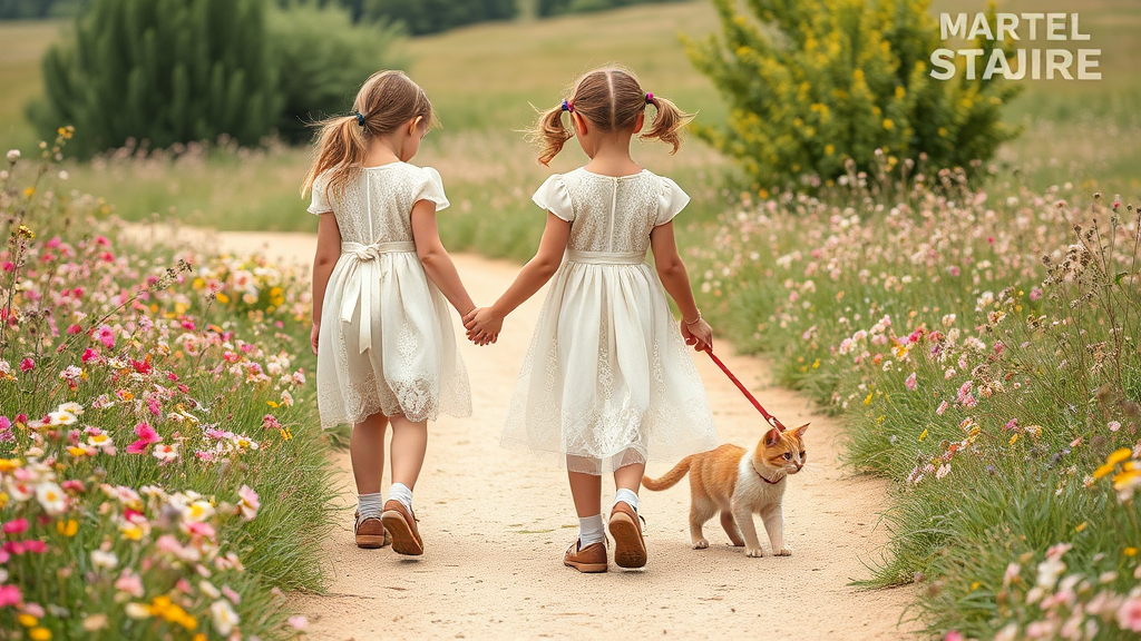 Two young girls in light pastel dresses stroll hand-in-hand along a gently textured path. They are enveloped by a meadow teeming with wildflowers in a medley of pastel hues. A light-orange tabby cat accompanied by one of the girls meanders on a leash, its path playfully intersecting the other girl's steps. The girls' dresses are intricately designed, flowing gracefully, adorned with delicate patterns in soft, muted tones. Their hair is styled in charming pigtails. The atmosphere is serene, bathed in soft, diffused light typical of an enchanting outdoor setting. This picturesque scene, captured in a canvas of pastel oil colors, showcases delicate brush strokes and a vibrant color palette, achieving a photorealistic and exquisitely detailed depiction.
