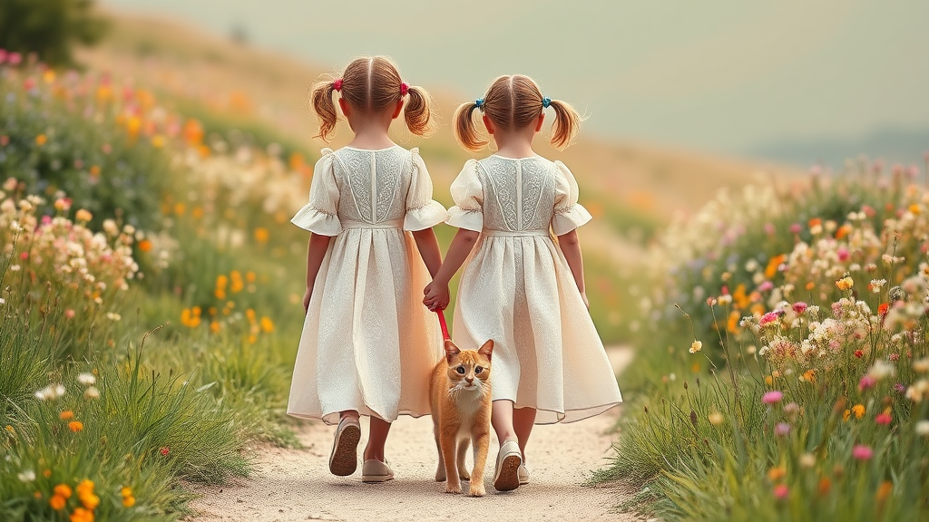 Two young girls in light-toned pastel dresses walk hand-in-hand along a gently textured path. They are surrounded by a lush meadow brimming with wildflowers in an array of soft pastel hues. A light-orange tabby cat meanders alongside them, its leash draping gracefully across the path as it walks just behind one of the girls. Both girls are dressed in elaborate, flowing frocks adorned with intricate patterns, their colors soft and understated. Their hair is fashioned into playful pigtails, enhancing the scene's charm. The lighting is softly diffused, capturing the serenity of an outdoor haven. The landscape feels like a delicate pastel oil painting, its gentle brush strokes creating a rich and vibrant color palette. Everything is captured with photorealistic detail, exuding an air of tranquility and whimsy.