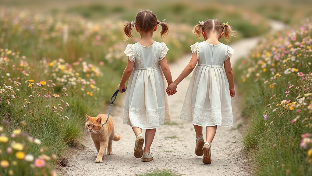 Two young girls in pastel-colored dresses walk hand-in-hand along a gently textured path, surrounded by a meadow where wildflowers bloom in an array of soft pastel shades. A light-orange tabby cat accompanies them, being led by one of the girls. Its leash crosses in front of the other girl, who follows closely behind. The girls' dresses are exquisitely detailed and flowing, featuring delicate patterns in muted colors. Their hair is styled in pigtails adorned with small wildflowers. The lighting is soft and diffuse, capturing the essence of an outdoor setting. The scene is tranquil, rendered in soft pastel oil colors with delicate brush strokes that create a rich and detailed palette, giving it a photorealistic quality.