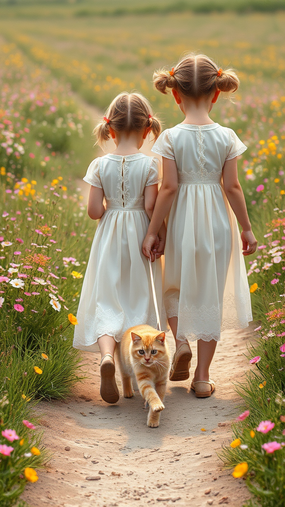Two young girls in soft pastel dresses walk hand-in-hand along a gently textured path, amidst a vibrant meadow filled with wildflowers in various hues of pastel. Accompanying them is a light-orange tabby cat, gracefully led by one of the girls with its leash overlapping playfully across the other girl, who walks just a step behind. The girls' dresses are flowing and intricate, showcasing delicate patterns in light, muted tones. Their hair is styled in charming pigtails. The lighting is gentle and diffused, enhancing the outdoor setting's tranquility. This picturesque scene is rendered as an oil painting with delicate brush strokes and a rich color palette. The artwork captures a photorealistic and detailed moment, with slight creative variations maintaining the serene and enchanting essence.