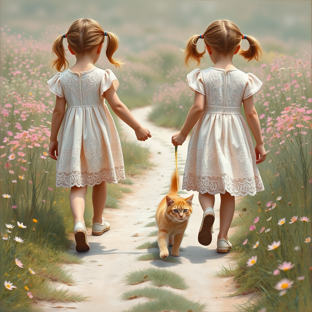 Two young girls in soft pastel dresses walk hand-in-hand along a lightly textured path, embraced by a meadow teeming with wildflowers of various pastel hues. A playful light-orange tabby cat is led by one of the girls, its leash gently curving in front of the other girl, who follows just a step behind. The girls' dresses are detailed and flowing, adorned with intricate patterns and soft, muted colors. Their hair is styled in pigtails that sway gently as they move. The lighting is soft and diffused, enhancing the serene, outdoor setting. This scene is depicted in a soft pastel oil painting, with delicate brush strokes and a rich color palette yielding a photorealistic and detailed portrayal.