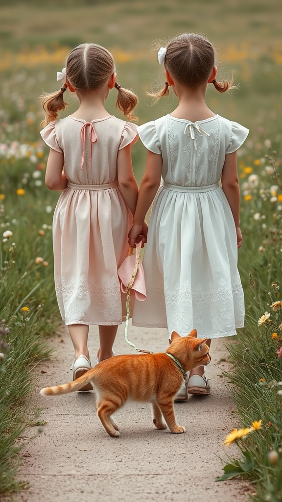 Two young girls in soft pastel dresses walk hand-in-hand along a gently textured pathway. They wander through a meadow alive with wildflowers in various pastel hues and shades. An orange tabby cat, held by one girl on a pastel-colored leash, trots by their side, crossing the path in front of the other girl, who follows closely. Their dresses flow gracefully, adorned with intricate patterns and muted tones, while their hair is styled in playful pigtails. The soft, diffused lighting of an outdoor setting bathes the scene in tranquility. This serene moment, reminiscent of an oil painting, is captured with delicate brush strokes and a rich color palette, offering a photorealistic, detailed depiction of pastoral beauty.