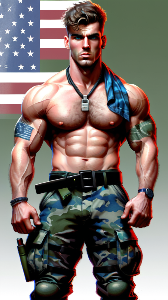 U. S. Army, military Sgt. Not afraid of hand-to-hand combat, this big brute lives for a good fight. Hypermasculine Caucasian male. Tall, muscular, brawny, broad chested, narrow waist, huge biceps, powerful legs, weightlifters build, Olympic body, big man. Handsome face with heavy 5 o'clock shadow, strong thick brows and squared, chiseled jaw. Short light brown hair, curly fade and tousled on top. Long camouflage bandana tied around his forehead. Striking, intense blue-grey eyes. Hairy and hirsute on chest, torso, legs, arms and especially armpits. Shirtless, exposed chest. American flag tattoo on right arm. Silver dog-tags around the neck. Black leather belt, green camouflage fatigue pants, black military combat boots. Full body pose, biceps up and armpits exposed. Lit cigar in mouth. {{{Hirsute hairy chest and abs}}}