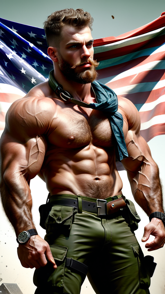 U. S. Army, military Sgt. Not afraid of hand-to-hand combat, this big brute lives for a good fight. Hypermasculine Caucasian male. Tall, muscular, brawny, broad chested, narrow waist, huge biceps, powerful legs, weightlifters build, Olympic body, big man. Handsome face with heavy 5 o'clock shadow, strong thick brows and squared, chiseled jaw. Short light brown hair, curly fade and tousled on top. Long camouflage bandana tied around his forehead. Striking, intense blue-grey eyes. Hairy and hirsute on chest, torso, legs, arms and especially armpits. Shirtless, exposed chest. American flag tattoo on right arm. Silver dog-tags around the neck. Black leather belt, green camouflage fatigue pants, black military combat boots. Full body pose, biceps up and armpits exposed. Lit cigar in mouth. {{{Hirsute hairy chest and abs}}}