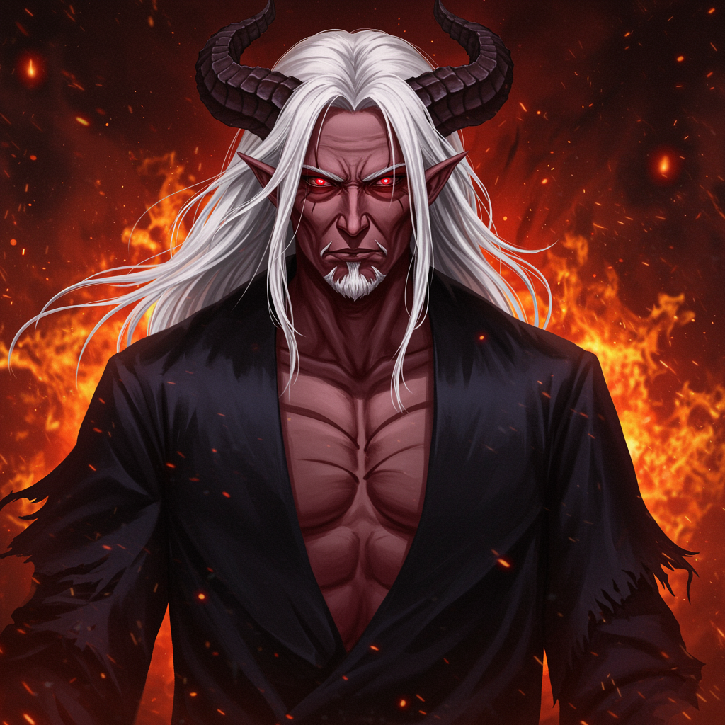 UHD, 164k, intricately detailed visage, anime demon mature man with dark robe; full body perspective, masterpiece, hyperdetailed full body, hyperdetailed strong face and pronounced nose, complete figure view, perfect physique, flawless anatomy; exquisitely detailed face with flowing white hair, glowing red eyes, alabaster skin, standing against a hellish backdrop engulfed in flames, illustration; refined composition; dark enigmatic eyes, shadowy setting, slightly unruly hair, elegantly tattered robe adding character and depth.
