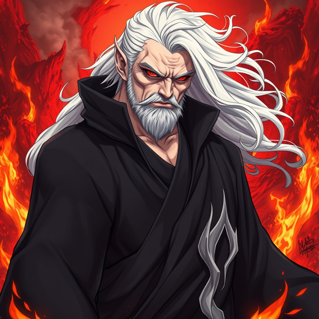 UHD, 164k, exquisitely detailed portrait, anime demon middle-aged man in a dark robe, full body view, artistic masterpiece, intricately detailed masculine features, complete body depiction, flawless physique, perfect anatomy, beautifully crafted face, flowing white hair, striking red eyes, alabaster skin, standing in an infernal backdrop surrounded by flames, illustration, hyperrealistic, modified focus, avoiding low quality, avoiding duplicates, enhanced clarity, maintaining accurate proportions, avoiding deformation, ensuring anatomical accuracy, avoiding blurriness, avoiding incompleteness, focused representation, cohesive anatomy, unified facial structure, avoiding excessive features, consistent limb depiction, harmonious composition.