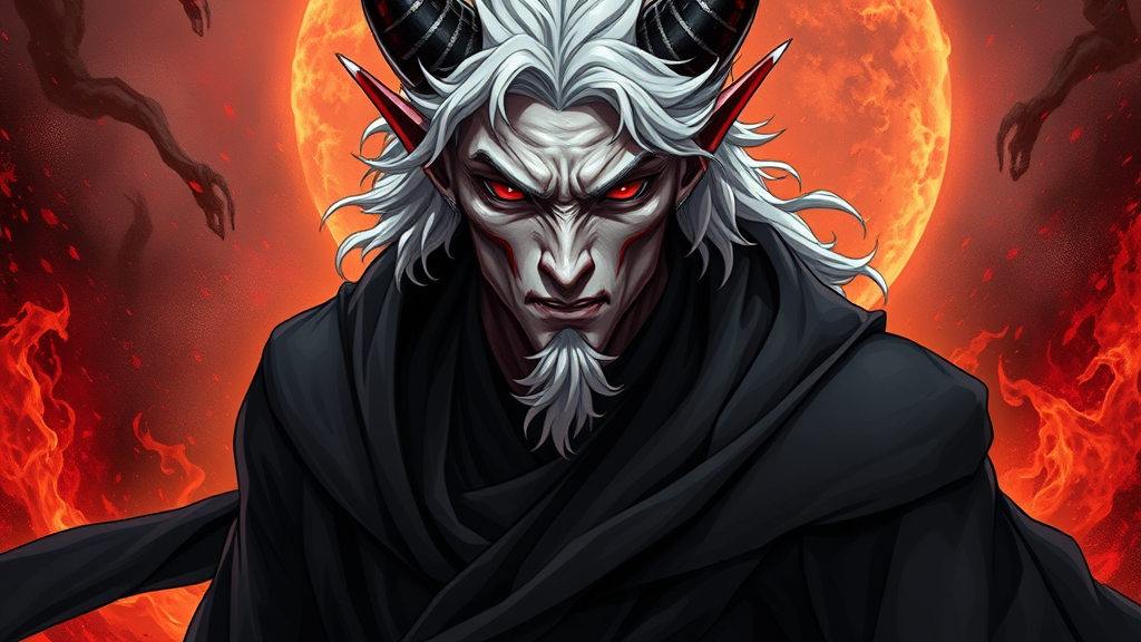 UHD, 164k, intricately detailed anime demon man in his middle years wearing a dark robe, full body view, masterpiece, hyperdetailed facial features and nose, complete and well-proportioned physique, exquisitely detailed face, cascading white hair, striking red eyes, pale white complexion, standing amidst a fiery inferno in a hellish backdrop, illustration, hyperrealistic depiction, errors such as low resolution, text disruptions, image compression issues, aesthetic complications like duplicates, morbid or distorted elements, figures with unnatural hands or faces, anatomical inaccuracies, disproportionate features, extra or missing limbs, fused or excessive digits, elongated necks, and unusual multi-limbed forms are absent, ensuring a visually coherent and captivating depiction.