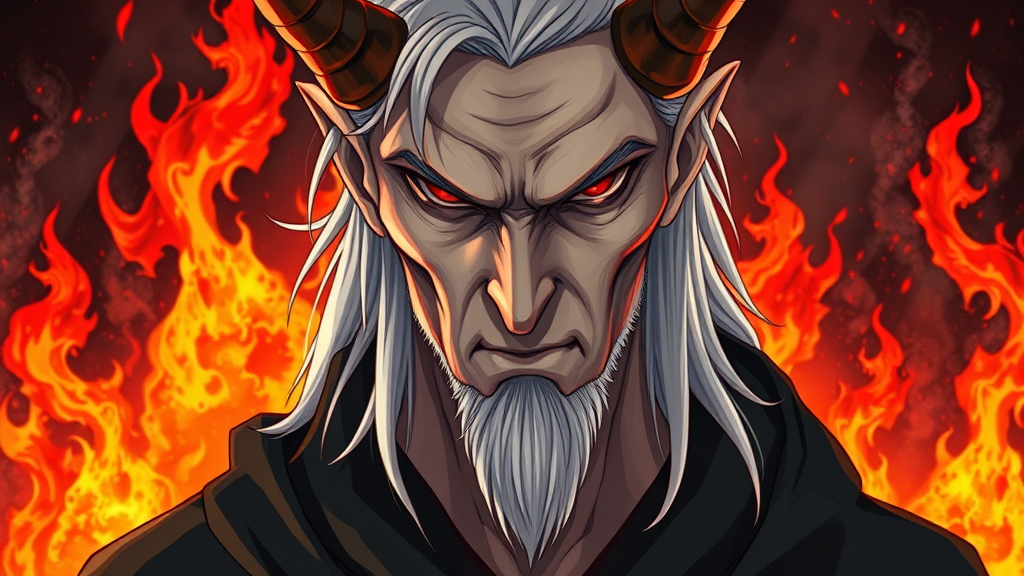 UHD, 164k, intricately detailed anime demon man in middle age, donning a dark robe, portrayed in full body with a panned out perspective, masterpiece quality, exceptionally detailed masculine face and nose, flawless anatomy and physique, exquisitely crafted face, long white hair, striking red eyes, pale skin, set against a hellish backdrop engulfed in flames, illustration, hyperrealistic approach, taking care to avoid low resolution, text overlay, cropping, or any defects like jpeg artifacts, unattractiveness, duplication, morbidity, mutilation, out-of-frame elements, additional or deformed features, poorly executed anatomy, disproportionate or malformed limbs, missing appendages, and any sketch-like attributes or inconsistencies.