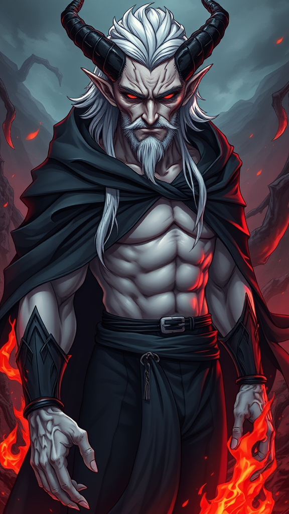 UHD, 164k, intricately detailed facial features, anime-inspired demon man in middle age wearing a dark cloak, full body view, masterpiece quality, hyperdetailed physique, sharply defined masculine face and nose, complete body depiction, flawless form, perfect anatomical structure, exquisitely detailed face, long white hair, striking red eyes, pale skin tone, standing amidst a hellish landscape with surrounding flames, illustration, hyperrealistic, avoid low-resolution, avoid text, maintain quality, minimize jpeg artifacts, unattractive elements, duplicates, or grotesque distortions, focus on proper frame and proportion, ensure natural hand and finger representation, maintain clarity, healthy anatomy, correct limb number, avoid cloning or disfigurement, ensure balanced proportions, well-formed limbs, accurate representation of body parts.