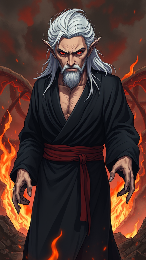 UHD, 164k, intricately detailed visage, anime-inspired demonic middle-aged man in a dark robe, captured in a full body panned-out view, artistic masterpiece, hyper-detailed full body and masculine features, complete body view, impeccable physique, flawless anatomy, exquisitely detailed facial features, long white hair, intense red eyes, porcelain-like skin, standing in a hellish landscape engulfed by flames, illustration, hyper-realistic portrayal, low-resolution qualities, text elements, cropped elements, low visual quality, jpeg imperfections, unattractive, duplicate features, morbid elements, altered appearance, out of frame components, atypical finger count, distorted hands, inaccurately rendered face, odd mutations, blurred features, parched appearance, incorrect anatomy, disproportionate design, additional limbs, repeated facial features, distorted expression, unappealing proportions, incorrectly formed limbs, missing limbs, surplus limbs, fused fingers, excessive finger count, elongated neck, substandard arm anatomy, unsatisfactory hand anatomy, multiple limbs, multiple legs, multiple facial features, sketch-like style, alternate skin tone, fragmented body, partially depicted face.