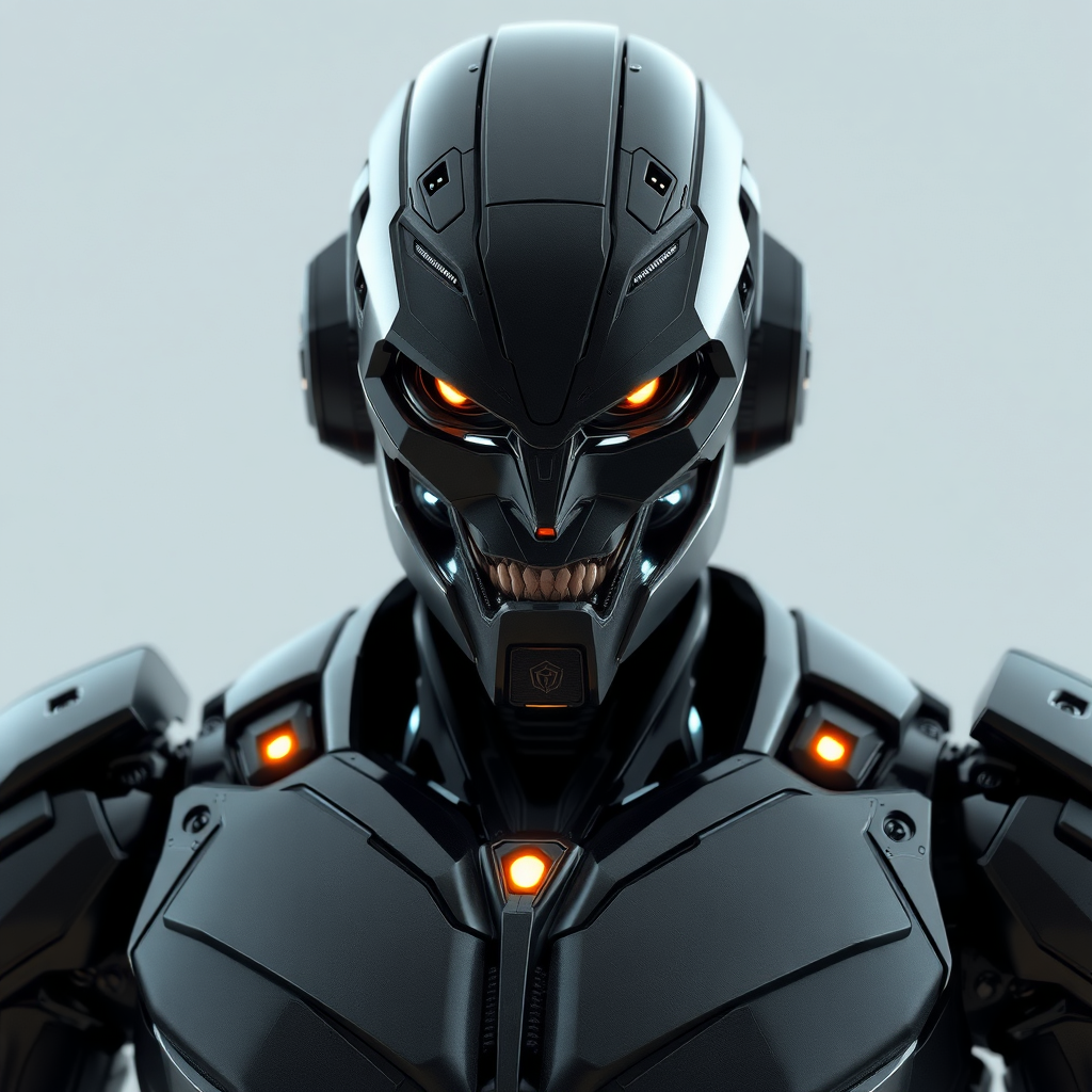 Ultimate detailed 3D render of a half-body shot featuring a charismatic, muscular humanoid villain robot with angular features and sleek, dark metallic surfaces. The robot boasts intricate, tiny details and realistic textures with high-reflective surfaces. Subtle bioluminescent accents glow amidst its sharp lines, hinting at advanced technology, while its expressive visage conveys a cunning intelligence.