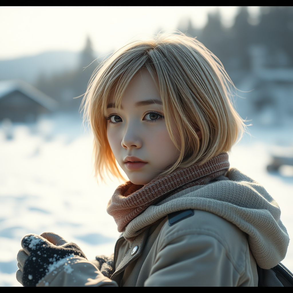 Ultra-detailed and realistic cinematic scene featuring a blonde Asian girl with short hair, exploring a snowy landscape. Captured in stunning 8k resolution, the scene conveys a natural and lifelike quality, reminiscent of trending art on platforms like ArtStation. Shot with a 3.5mm camera, the image captures the essence of exploration and discovery amidst the serene backdrop. The composition subtly plays with elements like light and shadow, bringing a sense of dynamism and depth. Despite intentional imperfections in anatomy and slight blurring, the image maintains a compelling narrative. Small artifacts and textural variations add character, enhancing the overall artistic appeal.