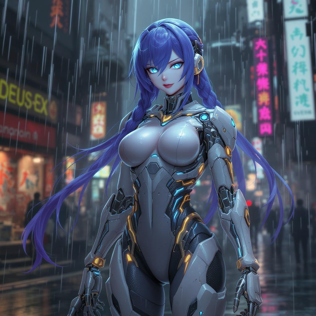 Ultra-detailed, anime style, solo female cyborg, long indigo braided hair, glowing turquoise eyes, porcelain skin, curvy and athletic physique, adorned in a futuristic armored bodysuit featuring white plating, dark gray carbon fiber tech segments, silver-accented joints, illuminated circuits tracing her arms and spine, sophisticated mechanical arms showcasing visible articulation and embedded technology, glowing neural ports along her back and neck, streamlined biomechanical spine, exuding a confident and tactical expression, high-tech visor retracted above one eye, atmospheric lighting, shadowy cyberpunk metropolis backdrop with vibrant signage, rain-slicked surfaces casting reflections, full-body portrayal, ultimate form, Deus Ex aesthetic, 768x1152 resolution.