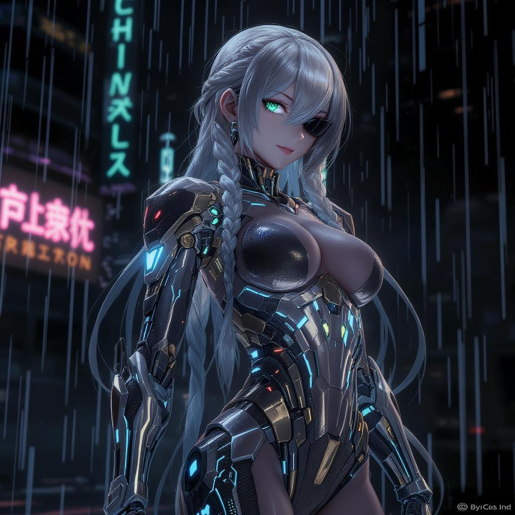 ultra-detailed, anime style, solo female cyborg, long braided silver-blue hair, glowing emerald eyes, pale skin, curvy and athletic body, wearing a futuristic armored bodysuit with silver plating, dark carbon fiber tech segments, platinum-accented joints, luminescent circuits on arms and spine, fully mechanical arms with intricate articulation and embedded tech, radiant neural ports on her back and neck, sleek biomechanical spine, confident and calculating expression, high-tech visor retracted above one eye, cinematic lighting, dark cyberpunk city background with luminous signage, wet surfaces reflecting light, full-body portrait, ultimate form, Deus Ex aesthetic, 768x1152 resolution, no green hair, no short hair, accurate hairstyle, precise eye color, seamless anatomy, sharp details, sophisticated, complete cybernetics, armored outfit, no plug suit, exact limbs, proportionate hands, no watermark, no text, uncropped.