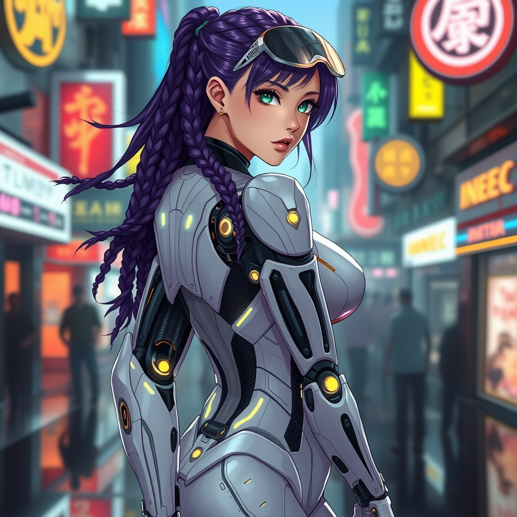 Ultra-detailed anime style solo female cyborg, with flowing purple braided hair, vibrant emerald eyes, alabaster skin, possessing a curvy yet athletic physique. Clad in a cutting-edge armored bodysuit featuring sleek white panels, interspersed with segments of black carbon fiber technology and gold-accented joints. Her bodysuit pulses with luminescent circuits tracing the length of her arms and spine. Her fully mechanical arms display intricate articulation and embedded technology, while glowing neural ports adorn her back and neck, complementing her streamlined biomechanical spine. She wears a confident and calculating expression, with a high-tech visor elegantly retracted above one eye. The scene is illuminated by cinematic lighting, set against a dark cyberpunk cityscape enlivened by neon signage, with slick surfaces reflecting the ambient glow. This full-body portrait captures her final form in a resolution of 768x1152, embodying a Deus Ex aesthetic. Avoid green hair, short or incorrect hairstyles, incorrect eye colors, anatomical distortions, blur, cartoonish features, missing cybernetics, soft outfits, plug suits, extra limbs, distorted hands, watermarks, text, or cropped aspects.