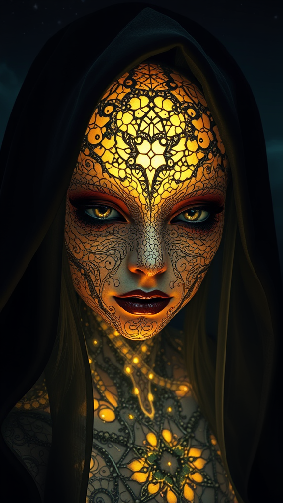 Ultra detailed artistic depiction, enveloped in a midnight ambiance, illuminated night sky, intricately beautiful visage, ethereal and glowing presence, lit from behind, captivating allure, shimmering softly, interplay of shadows, oil painted texture, smooth transitions, high-definition clarity, cinematic eight-dimensional sharpness, inspired by Alberto Seveso, Artgerm, Loish, sci-fi theme, complex and mesmerizing masterpiece, subtly foreboding, cinematic matte poster style, harmoniously composed by the golden ratio, trending on CGSociety and ArtStation, echoing the styles of Artgerm, H.R. Giger, and Beksinski, exceptionally detailed, vibrant and dynamic, cinema-quality character concept, superior CGI model, doll-like quality, Octane-rendered.