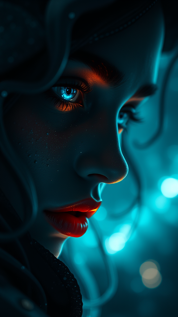 Ultra-detailed artistic photography capturing the enchanting essence of a midnight aura under the night sky. The scene showcases a detailed and gorgeous face with a dreamy, ethereal glow and backlit highlights, emphasizing glamour and glimmer combined with shadows. This imagery resembles an oil on canvas painting with visible brush strokes that are smooth and refined. The composition is ultra high definition, akin to an 8k Unreal Engine 5 creation, maintaining ultra-sharp focus. Inspired by the works of renowned artists like Alberto Seveso, Artgerm, and Loish, this intricate artwork is a masterpiece with an ominous undertone, akin to a matte painting movie poster. The design follows the golden ratio, bringing harmony to the elements, all while trending on platforms like CGSociety and ArtStation. The style echoes the artistic flair of H.R. Giger and Beksinski, with a highly detailed and vibrant production cinematic character render. The model is of ultra-high quality, creatively cropped to emphasize the surreal beauty and mystique of the face, while avoiding any notions of deformity or unrealistic anatomy.