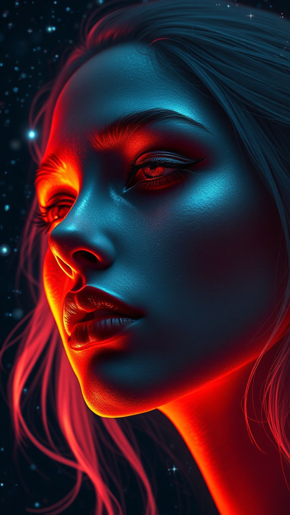 Ultra detailed artistic photography, midnight aura, starry night sky, stunningly detailed face, ethereal and dreamy, softly glowing, backlit elegance, shimmering glamour, intriguing shadows, oil on canvas texture, smooth brush strokes, ultra high definition, 8k clarity, crafted with unreal engine precision, ultra sharp focus, inspired by art styles of Alberto Seveso, Artgerm, and Loish, sci-fi influence, intricate masterpiece, mysterious and matte painting movie poster quality, following the golden ratio, trending on CGSociety and ArtStation, epic composition by Artgerm, H.R. Giger, and Beksinski, highly detailed with vibrant production, cinematic character rendering, ultra high-quality model aesthetics, creative interpretation with unique touches while maintaining the essence.