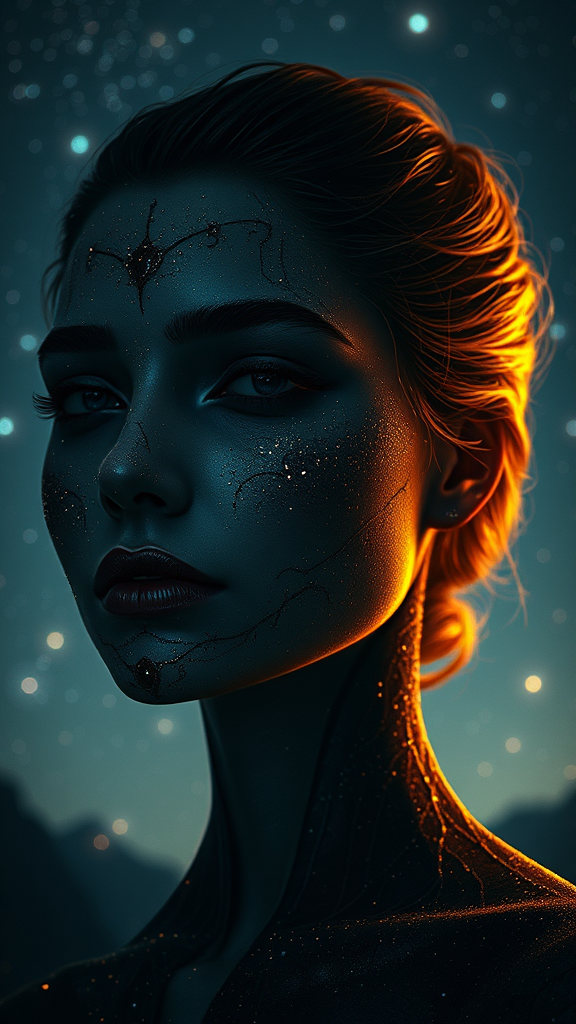 Ultra detailed artistic photography, midnight aura, starlit sky, exquisitely detailed face, ethereal, glowing, softly backlit, glamorous, shimmering, deep shadows, oil on canvas texture, elegant brush strokes, ultra HD, 8k resolution, surreal unreal engine 5 rendering, crystal clear focus, inspired by artists like Alberto Seveso, Artgerm, and Loish, sci-fi undertones, intricate masterpiece, mysterious, matte painting cinematic style, golden ratio aesthetics, trending on CGSociety, complex and epic, featured on ArtStation, influenced by Artgerm, H.R. Giger, and Beksinski, highly detailed, vibrant, cinematic character design, ultra high-quality cropped model, out of focus background, enigmatic allure.