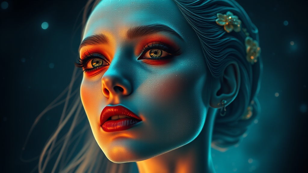 Ultra-detailed artistic photography, midnight aura, mesmerizing night sky, exquisitely detailed face, ethereal, glowing presence, delicately backlit, glamorous with a shimmering allure, subtle shadows, oil on canvas texture with fluid brush strokes, ultra high definition, 8k, striking clarity, artistry with an Unreal Engine 5 touch, ultra-sharp focus, inspired by Alberto Seveso, Artgerm, and Loish, sci-fi influence, a masterpiece of intricate artistry, slightly ominous, reminiscent of a matte painting movie poster, harmonious golden ratio, trending on CGSociety and ArtStation, rich in detail, epic in scale, production-level cinematic character render, ultra high quality featuring visually striking composition, artistic inspiration by Artgerm, H.R. Giger, and Beksinski, vibrant and visually compelling. Avoids focus on excessive or abnormal features, emphasizing beauty and allure while maintaining artistic integrity.