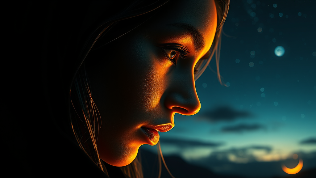 Ultra detailed artistic photography of a stunning midnight scene featuring a night sky that beautifully frames a detailed, gorgeous face. The image exudes a dreamy, glowing essence with a backlit glamour and glimmer, accentuated by intricate shadows. The composition resembles oil on canvas with visible brush strokes, offering a smooth, ultra high definition experience in 8k. The scene utilizes Unreal Engine 5 for ultra sharp focus, drawing inspiration from the art styles of Alberto Seveso, Artgerm, and Loish. It captures the essence of a highly detailed, vibrant, cinematic character render, with an intricate artwork masterpiece vibe. The image embodies an ominous and matte painting movie poster aesthetic, showcasing elements of the golden ratio. It's a trending piece on CGSociety and ArtStation, with creative influences from H.R. Giger and Beksinski. The character is depicted with a perfect anatomy and harmonious proportions, maintaining focus on an epic, intricately designed figure with no imperfections or distortions. The overall presentation is of ultra high quality, celebrating the artistry of meticulously crafted elements in a seamless, harmonious blend of light, form, and detail.