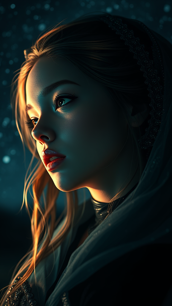 Ultra detailed artistic photography of a stunning character with a midnight aura under a starry night sky, showcasing a beautifully detailed face that exudes a dreamy, glowing quality with a backlit glamour. The scene is filled with glimmering shadows reminiscent of oil on canvas art, smooth brush strokes in an ultra high definition, 8k resolution. With an ultra sharp focus as if rendered in Unreal Engine 5, this masterpiece piece evokes the signature styles of artists like Alberto Seveso, Artgerm, and Loish. There's a subtle, ominous tone akin to a matte painting movie poster, aligned perfectly with the golden ratio. The artwork is impeccably intricate and trending on platforms like CGSociety and ArtStation, showcasing vibrant colors and epic scale reminiscent of H. R. Giger and Beksinski’s conceptual imagination. The pinnacle of production cinematic character rendering—this ultra high quality CGI model possesses lifelike detail, akin to an exquisitely crafted 3D doll. This Octane render is free from artifacts or distortions, presenting impeccable anatomy and flawless proportions with no superfluous or malformed features.