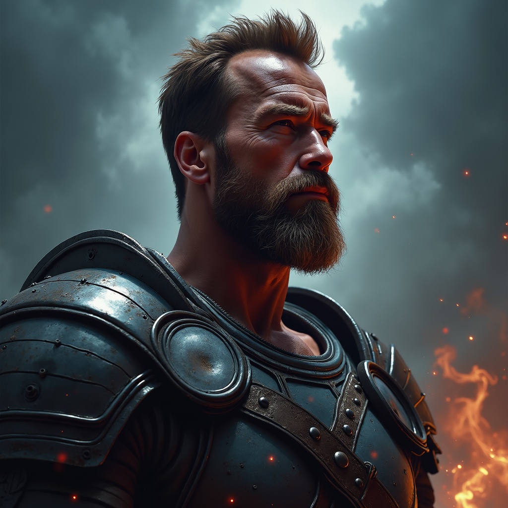 Ultra detailed beautiful painting of Arnold Schwarzenegger as a majestic God of War, centered, trending on artstation, with a realistic and cinematic style, dramatic shadows highlighting his powerful features, a blend of artistic techniques by Greg Rutkowski and Makoto Shinkai, set against a stormy sky with hints of vibrant colors that add an epic atmosphere, armor glistening under the dim light, capturing a timeless strength and wisdom.