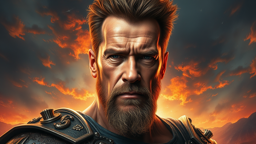 Ultra detailed beautiful painting professional portrait of Arnold Schwarzenegger envisioned as the God of War, centered composition, trending on ArtStation, ultra-realistic and cinematic with dramatic and intense shadows, infused with the artistic styles of Greg Rutkowski and Makoto Shinkai, enhanced with a mythical landscape background and fiery skies, adding elements of ancient armor and ethereal glow to emphasize his divine presence, maintaining a balance of power and serenity.