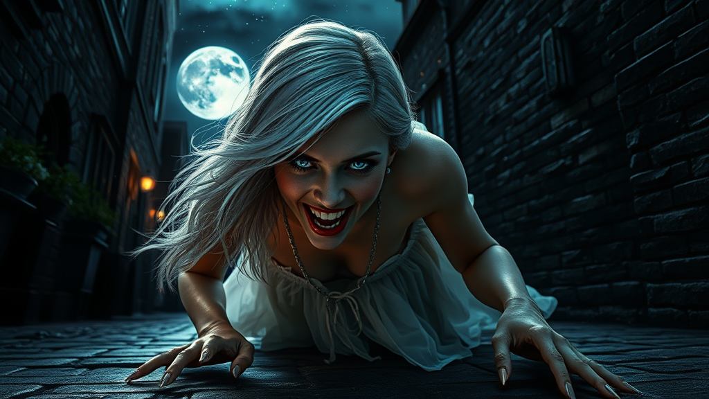 Ultra-detailed CG 8k wallpaper of an enthralling vampire woman with ethereal white hair and glowing, unforgettable tan skin, poised to bite the viewer in a haunting Victorian back alley. Enveloped in the mystique of night time, her mouth slightly open, revealing glistening vampire fangs and the telltale sign of blood dripping seductively from her lips. She wears a tattered yet mesmerizing white dress, its fabric giving the illusion of fluttering shadows, as she crawls gracefully on the cobblestone ground. The scene's dramatic lighting casts intriguing shadows that enhance her allure, while the night sky is peppered with twinkling stars and dominated by a majestic full moon that paints the alley in an eerie silver glow. Inspired by the artistry of Greg Rutkowski, this visual masterpiece captures the perfect fusion of beauty and terror, inviting viewers into its captivating nocturnal embrace.