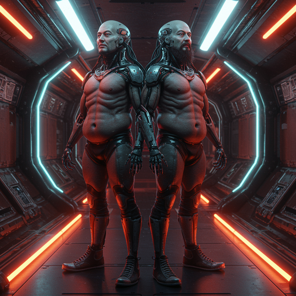 Ultra-detailed cyborg in a futuristic spaceship environment, featuring anthropomorphic cybernetic skeleton elements integrated into sleek metal armor. Neon lights play across the surface, utilizing reflection mapping to enhance the intricacy and detailed design. Dramatic and cinematic lighting highlights a hyperrealistic scene. The composition includes two distinct faces representing two personas, focusing on a conceptually rich and dynamic pairing. The design incorporates attention to unique details such as shoe laces, dual navels, an enlarged head, a long beard, and pointed footwear with heels. While maintaining a photorealistic approach, the scene subtly suggests a blend of elements leading to creative mutations such as fused fingers and unconventional anatomy, delivering an otherworldly yet cohesive visual narrative.