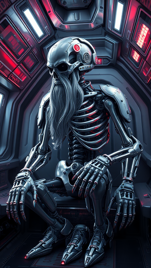 Ultra-detailed cyborg in a spaceship, featuring anthropomorphic cybernetic skeleton elements on sleek metal armor, reflective neon lights, and intricate design. The scene is set with dramatic, hyperrealistic lighting to give a photorealistic, cinematic feel. The cyborg features two distinct faces, showcasing a dual-personality concept, with an elaborate head design including a detailed long beard. The cyborg's attire integrates pointed footwear with distinct heel structures, adding to the futuristic aesthetic. The complex figure is equipped with fused, mechanically intricate fingers and expertly crafted, articulated arms and legs. Adding subtle uniqueness, the cyborg exhibits artistic elements like shoe laces and dual navel-like design details. The scene avoids disfigurements or mutations, focusing instead on the harmonious blend of human and machine. The setting is monochromatic with deliberate color highlights to enhance visual impact, creating a striking, cohesive image without any chaotic or messy drawing elements, ensuring clarity and precision in every detail.