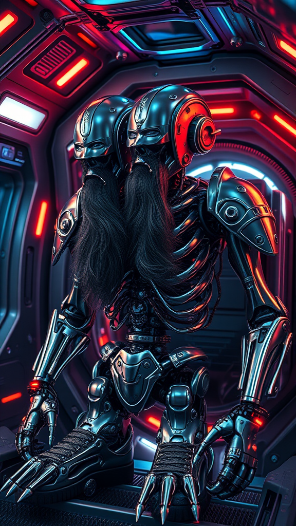 Ultra-detailed cyborg in a spaceship with anthropomorphic cybernetic skeleton elements on metal armor, featuring neon light reflections and intricate design details. The scene is set with dramatic lighting, capturing a hyperrealistic, photorealistic, and cinematic atmosphere. The cyborg has two distinct faces, emphasizing duality, and exhibits unique features such as long beards and pointed footwear. The design is elaborate, incorporating reflective mapping and textures that highlight the complexity of its form, including large heads, elaborate shoe laces, and two navels. The android's presence is powerful and enigmatic, with an aura of intentional intricacy, harmoniously blending advanced technology with human-like elements.