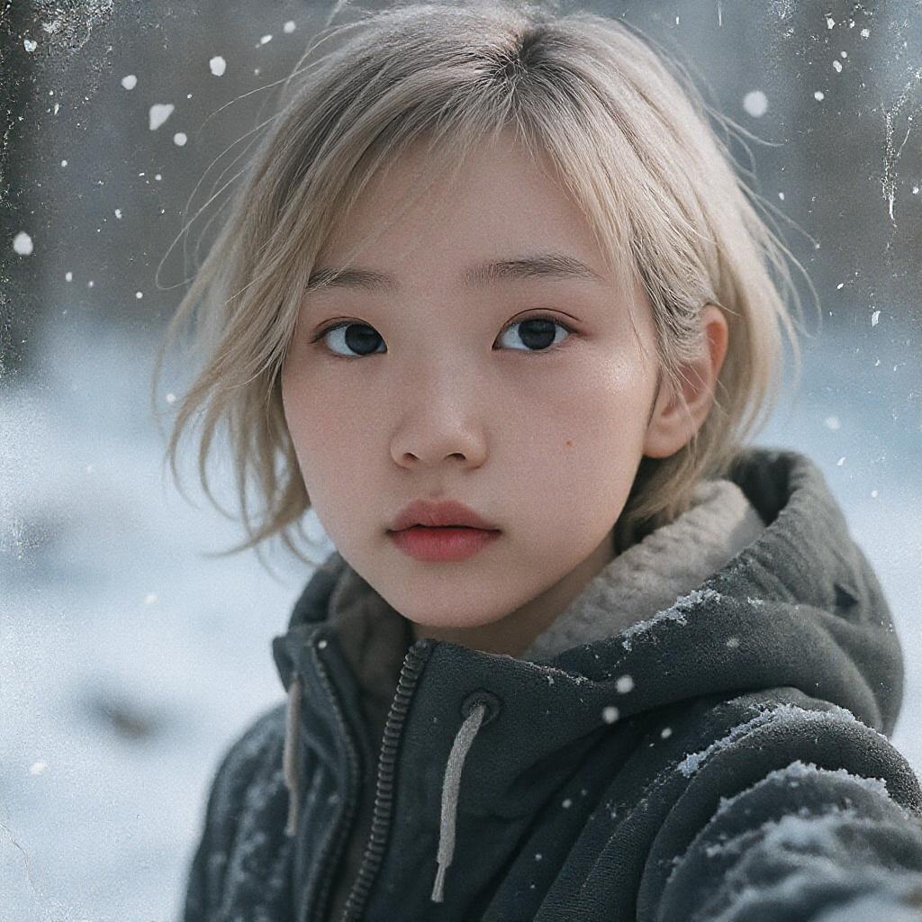 Ultra-detailed depiction of a girl with short, natural blonde hair, set against a snowy backdrop, capturing an Asian descent character with realistic features. The cinematic light enhances her expression, suggesting a sense of exploration and wonder. Her visage is rendered in 8k, inspired by trending artstation styles, blending realism with a 3.5mm camera perspective. The image intentionally incorporates low resolution elements, with imperfect anatomy such as missing or extra digits, reflecting organic flaws. Cropped edges give a candid feel, and the overall composition presents a juxtaposition of quality levels, from blurry patches to areas exposed with jpeg artifacts, occasional watermark glimpses, and segments that are out of focus, conveying an authentic, raw snapshot.