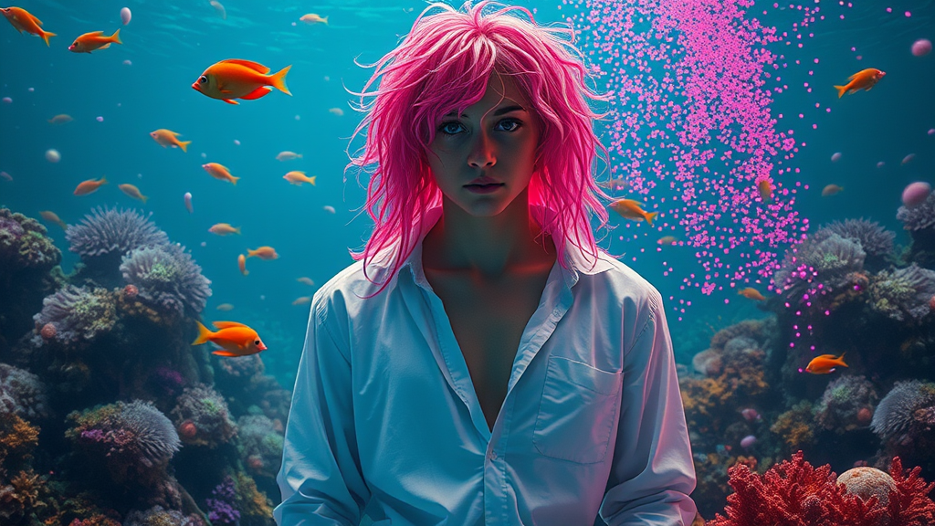 Ultra detailed depiction of a figure with long pink hair styled in messy curls, featuring an ahoge, and appearing slightly wet. The character wears a white shirt unbuttoned, standing amidst an ocean setting populated with colorful fish and vibrant coral reefs. Shells are scattered around as the scene is illuminated by glowing pink particles suspended in the water, casting an ethereal glow. The figure maintains an emotionless expression, contributing to the surreal underwater atmosphere. The image is captured in ultra-high-definition quality, with an 8K resolution that enhances every intricate detail, creating a stunning visual experience. Subtle creative adjustments enhance the composition while preserving the essence of the original vision.
