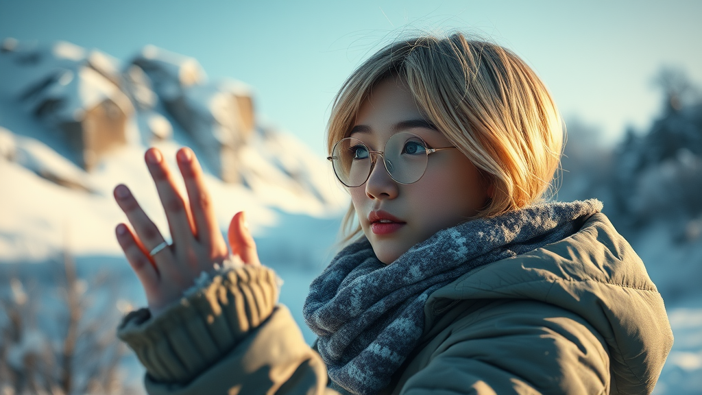Ultra detailed depiction of a girl with short blonde hair, natural and realistic with a cinematic touch, exploring snowy landscapes. The scene captures an Asian girl in 8k resolution, with an emphasis on light and shadow, reminiscent of trending artwork on ArtStation. The image showcases a realistic portrayal, centered around exploration, shot with a 3.5mm camera lens, albeit with intentional elements of low resolution and imperfections like bad anatomy, blurred hands, and some fingers missing or having extra digits. The composition is cropped, highlighting a mix of varying quality, including low and normal, with subtle jpeg artifacts and a slightly blurry focus. Elements such as exposure and a faint watermark or text may be present, adding to the candid, exploratory essence of the scene.