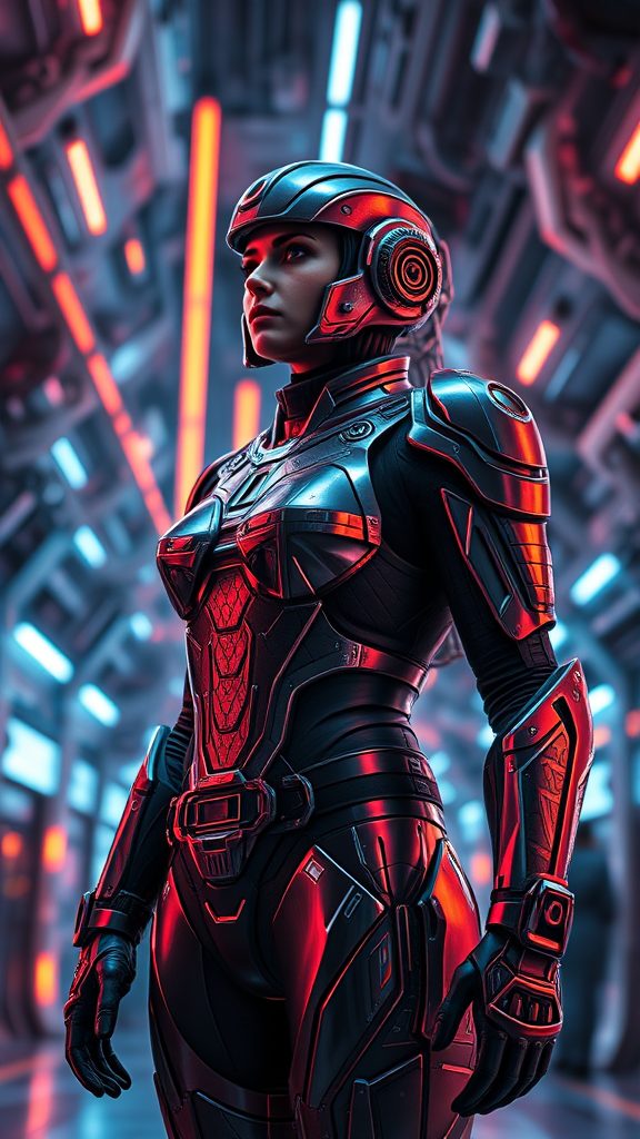 Ultra-detailed female space ranger in advanced cybernetic armor standing in the midst of a bustling space station, where neon lights cascade over her suit creating vibrant reflections. The armor boasts an intricate design with precise engravings and subtle luminescent elements. Dramatic shadows interplay with the lighting to highlight the hyperrealistic textures and contours of her suit, creating a cinematic atmosphere. The scene is captured in stunning 8k resolution, emphasizing the photorealistic details and expansive futuristic setting. Her stance is poised and alert, reflecting a sense of readiness and curiosity, as she gazes out into the vastness of space from the station.