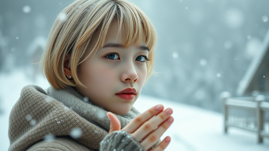 Ultra detailed girl with short blonde hair, natural and realistic in a cinematic scene, exploring a snowy landscape. Asian descent, depicted in 8K resolution for a highly detailed and dynamic image reminiscent of a trending piece on ArtStation. Captured using a 35mm camera lens to emphasize depth and clarity, despite intentionally incorporating low-res elements and imperfections. The depiction includes intentional flaws like bad anatomy, awkward hand positioning, missing or extra fingers, and cropped framing, all contributing to a unique artistic style. Appears with typical jpeg artifacts, offering a slightly blurry and exposed finish, along with hints of watermark and text intrusion, maintaining an authentic, raw quality.
