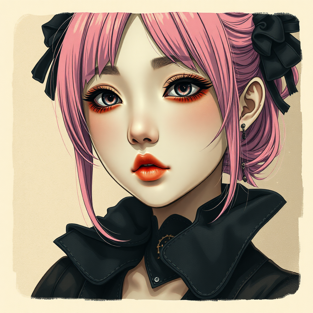 Ultra detailed illustration of a pretty Japanese woman with gothic clothing, featuring an extremely detailed face and showing skin pores. The image is inspired by RAW photography with a hint of film grain, trending on deviantart. The scene includes sepia tones and elements of both 3D and sketch-style art. The woman's pink hair and unique makeup give her a striking appearance. Despite some abstract artistic choices like multiple eyebrows and creative use of shadows, the character embodies a captivating aesthetic that blends realism with imaginative elements. The overall vibe harmonizes analog photo charm with modern digital artistry.