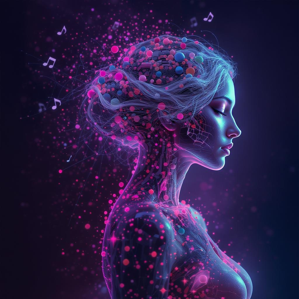 Ultra detailed illustration of a woman's luminous silhouette, a surreal and ethereal figure, adorned with radiant neon hues and vibrant, colorful particles. The scene is akin to a backlit cyberpunk dreamscape, with soft, cinematic lighting enhancing her ghostly presence. Her fragmented form resembles a mosaic, with body parts breaking away as if dissolving into a spectrum of spheres. Some aspects appear to be bleeding into a mechanical disassembly. Rendered in high definition with octane rendering technology, the masterpiece boasts intricate details and a vast, ultra-wide field of view. There's a stunning depth of field with intensely dynamic lighting and captivating shadows. The atmosphere is alive with vibrant colors and the dramatic interplay of light and darkness. Musical notes seem to dance through the air, visible as if streaming in ecstasy, adding an auditory dimension to the visual spectacle. The scene is captured in HDR, immersing viewers in an experience that is both hauntingly beautiful and richly atmospheric.