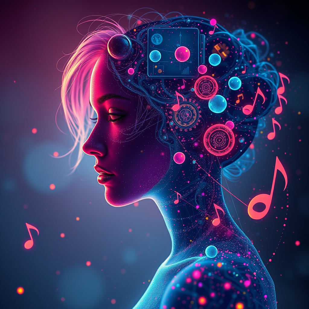 Ultra detailed illustration of the ethereal outline of a woman, an otherworldly figure, illuminated by neon light, adorned with colorful particles, CMYK palette, backlit with a cyberpunk flair, enveloped in soft, natural volumetric cinematic light, exuding a ghostly presence. Her form exhibits mosaic-like fragmentation, with spheres emanating from the visage and vivid bleeding mechanical elements. This high-detail composition features floating fragments, rendered in 8k with octane mastery, maintaining masterpiece quality and scale. The scene showcases breathtaking depth of field and an ultra-wide perspective, enhanced by ultra-dynamic lighting and striking shadows. Vibrant colors interplay with atmospheric, dramatic lighting, creating an ecstasy of visible musical notes streaming around her, captured in HDR splendor.
