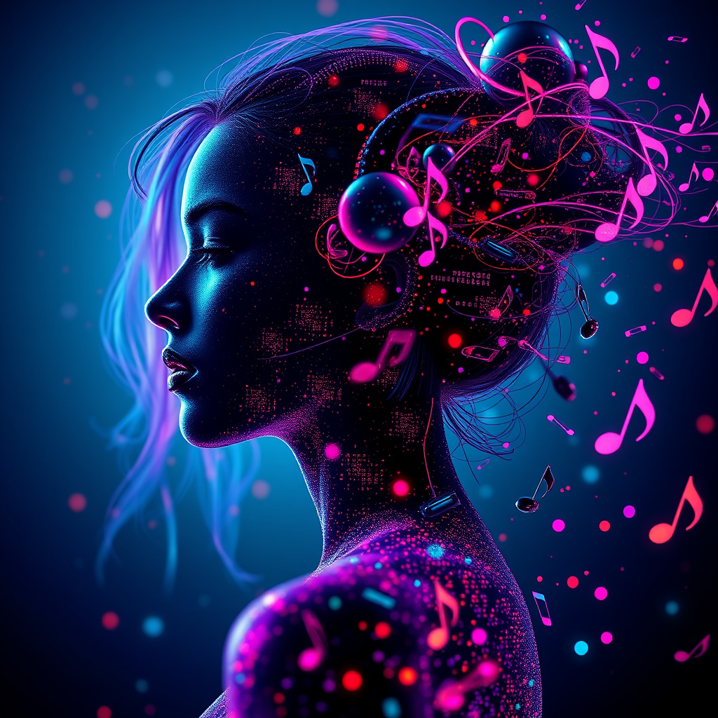 Ultra detailed illustration of the ethereal silhouette of a woman, a phantasmagorical figure infused with neon and colorful particles, rendered in vibrant CMYK colors. The image is backlit, featuring a cyberpunk aesthetic with soft natural volumetric cinematic lighting. The figure appears ghost-like, with a motion blur effect. Her fragmented body is presented as a mosaic, with spheres breaking off her face, blending into a bleeding mechanical fragmentation. The scene is captured in high detail, with floating parts emphasized in an 8k resolution octane render masterpiece. The depth of field is beautifully maintained, offering an ultra-wide perspective with ultra-detailed CG elements. The dynamic lighting creates amazing shadows, enhancing the vibrant colors and dramatic atmosphere. The composition is further enriched by the ecstasy of musical notes streaming through the air, creating an atmospheric hdr environment.