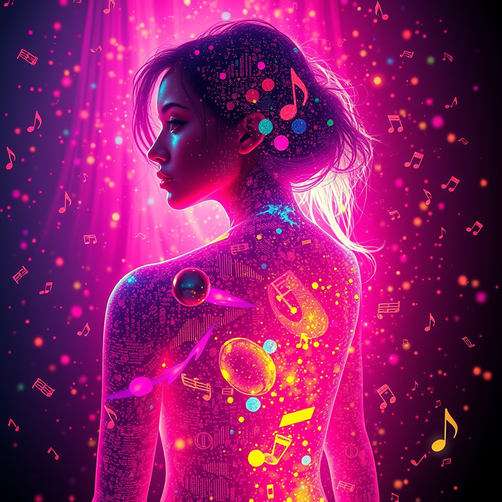 Ultra detailed illustration of the ethereal silhouette of a woman, a phantasmagorical figure with vibrant neon hues, surrounded by a cascade of colorful particles in CMYK colors, illuminated from behind with a cyberpunk aesthetic. The scene features soft, naturally volumetric cinematic lighting, capturing the essence of a spectral presence. Her body appears fragmented, with pieces forming a mosaic pattern, and spheres delicately breaking away from her face, reminiscent of mechanical fragmentation. The composition features high detail, with pieces floating intricately, rendered in 8K with the mastery of an octane render. The perspective provides a beautiful depth of field, with an ultra-wide view capturing dynamic lighting and mesmerizing shadows. The scene is rich with atmospheric vibrancy, as streams of visible musical notes weave ecstatically through the air, enhanced by HDR effects for dramatic impact and vibrant color expression.