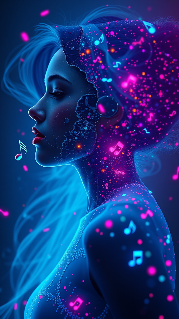 Ultra detailed illustration of the illuminated silhouette of a woman, an ethereal and phantasmagorical figure, with neon lights and colorful particles in CMYK hues, backlit in a cyberpunk setting. The scene features a soft natural volumetric cinematic light, evoking the presence of a ghost. Motion blur adds to the mystique, with fragmented body parts displayed like a mosaic. Spheres break off her face, bleeding into mechanical fragmentation. The image is rich in high detail, with floating parts captured in 8k resolution through an octane render, creating a masterpiece of vibrant colors and dynamic lighting. The depth of field is stunning, with an ultra-wide perspective and dramatic, atmospheric shadows. Musical notes swirl in ecstasy, visibly streaming through the air, enhanced by HDR effects.
