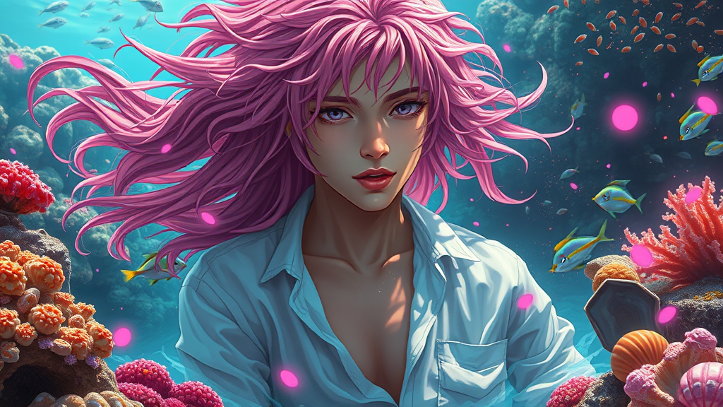 Ultra detailed image of a person with flowing pink hair, long and messily curled with an ahoge. The character is partially submerged in the ocean, wearing a wet white shirt that is unbuttoned. They appear emotionless, surrounded by vibrant coral reefs and schools of fish, with an assortment of shells visible nearby. Pink glowing particles add a magical aura to the scene. The atmosphere is captured in vibrant UHD, HDR, and 8K resolution, ensuring stunning clarity and detail.
