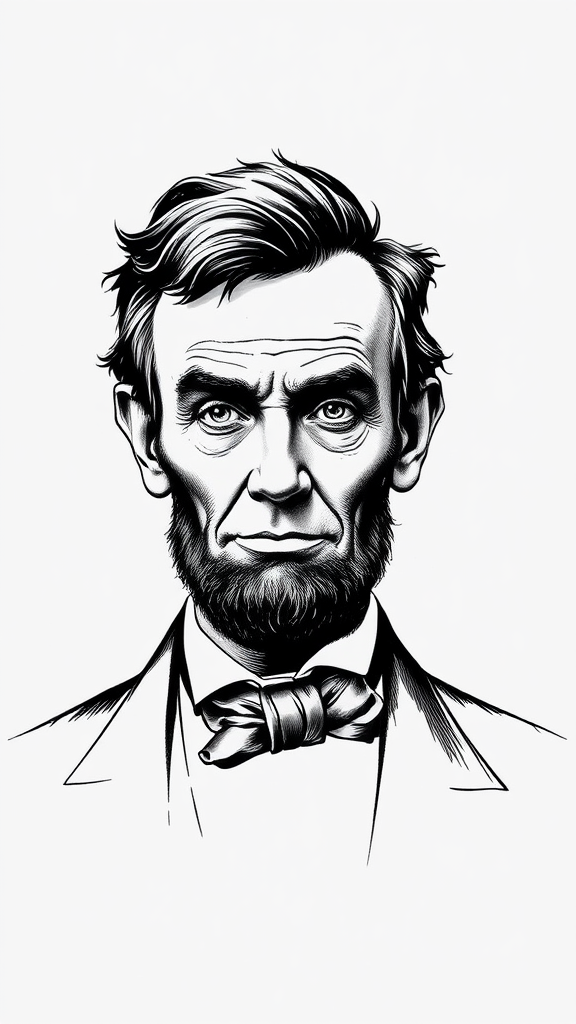 Ultra-detailed ink illustration, Abraham Lincoln with lifelike features, monochrome portrait set against a blank backdrop.